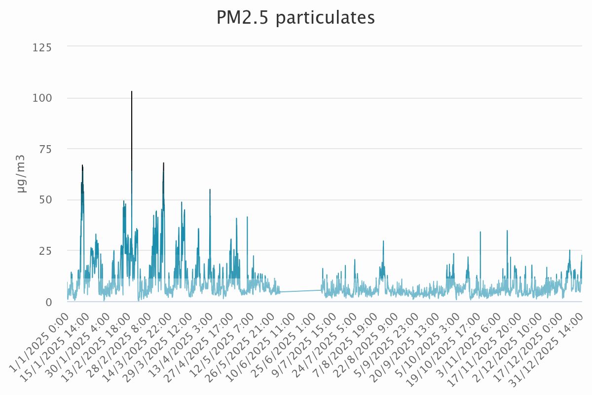 Air quality on site over 2025, via our Breathe London air quality monitor. Get in touch if you’re interested in being part of a group exploring how we interpret and communicate this data.